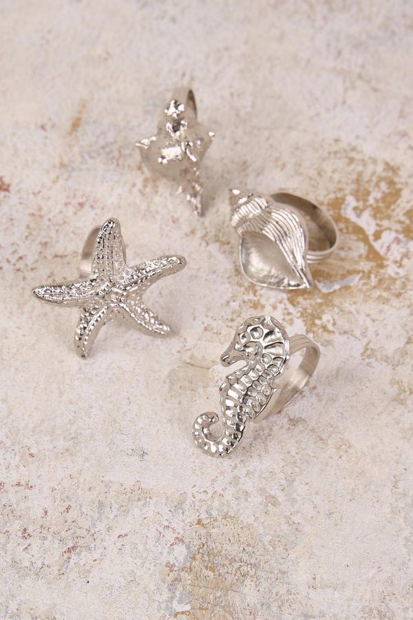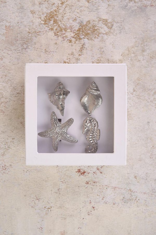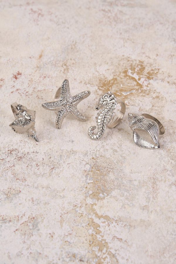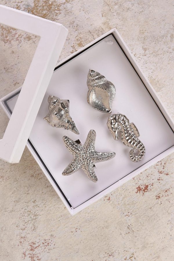 A whimsical way to tie your festive table together, this set of 4 napkin rings will add a touch of coastal style to summer entertaining. Featuring sea star, sea horse, conch and miter shell designs in silver, pair this napkin ring set with our matching Seaside Linen Napkin Set.